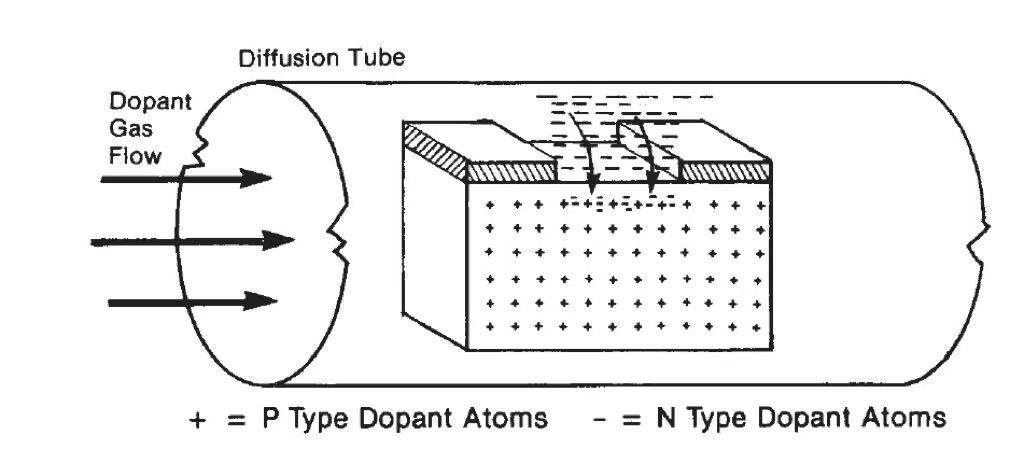 1. A magas hőmérsékletű diffúzió egy hagyományos módszer a félvezető adalékolására. Az ötlet az, hogy a félvezetőt magas hőmérsékleten kezeljék, ami a szennyező atomok diffundálását okozza a félvezető felületéről a belsejébe. Mivel a szennyező atomok jellemzően nagyobbak, mint a félvezető atomok, a kristályrácsban lévő atomok hőmozgása szükséges ahhoz, hogy ezek a szennyeződések intersticiális üregeket foglaljanak el. A diffúziós folyamat során a hőmérséklet és az idő paramétereinek gondos szabályozásával lehetőség nyílik a szennyeződések eloszlásának hatékony szabályozására ezen a jellemzőn alapulva. Ezzel a módszerrel mélyen adalékolt csomópontok hozhatók létre, mint például a CMOS technológia kettős lyukú szerkezete.
