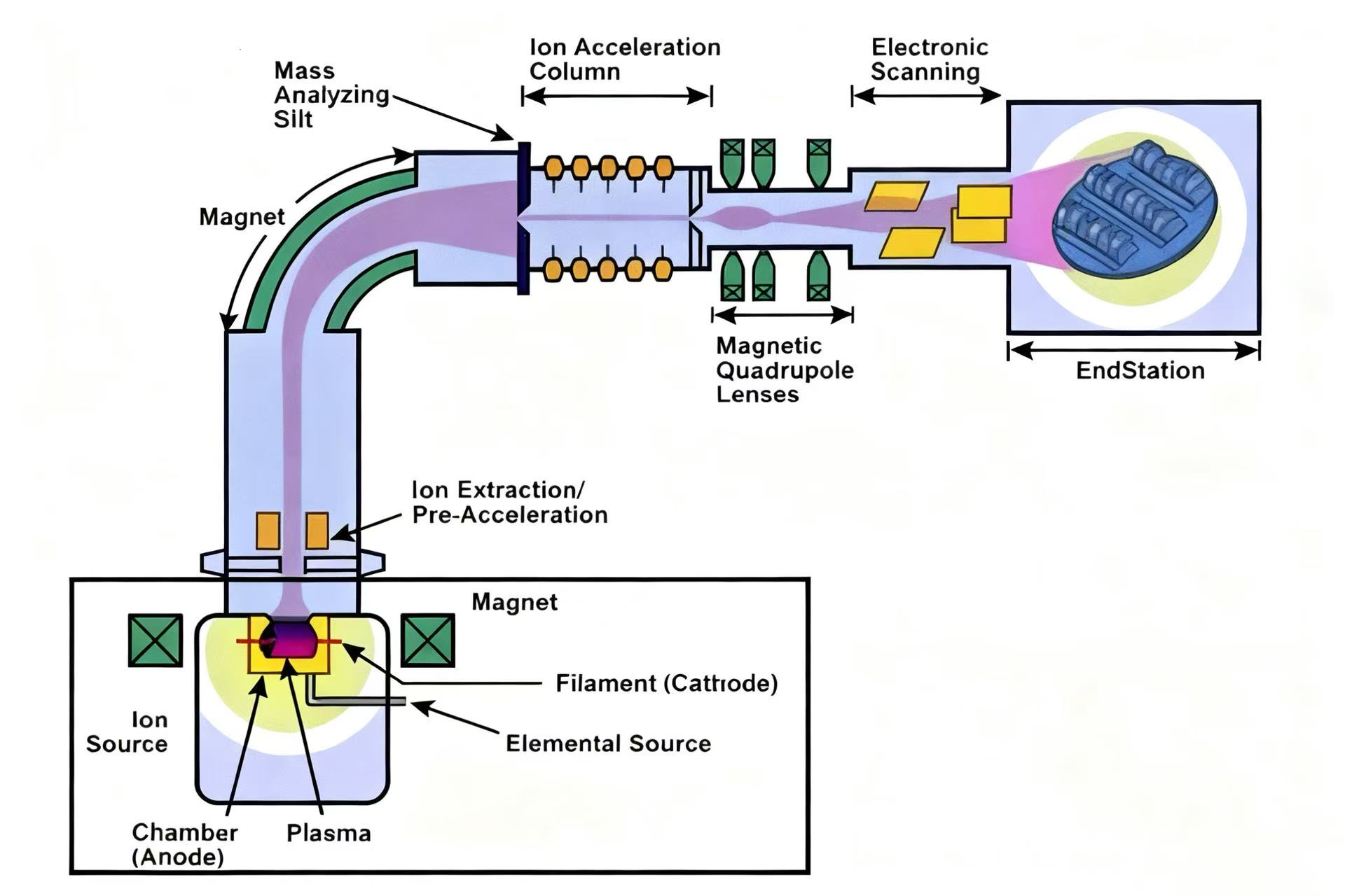 2. Az ionimplantáció az elsődleges adalékolási technika a félvezetőgyártásban, amelynek számos előnye van, mint például a nagy adalékolási pontosság, az alacsony folyamathőmérséklet és a szubsztrátum anyagának csekély károsodása. Pontosabban, az ionbeültetési folyamat magában foglalja a szennyező atomok ionizálását, hogy töltött ionokat hozzon létre, majd ezeket az ionokat egy nagy intenzitású elektromos téren keresztül gyorsítsák fel, hogy nagy energiájú ionnyalábot képezzenek. A félvezető felületét ezután ezek a gyorsan mozgó ionok megütik, lehetővé téve a precíz beültetést állítható adalékolási mélységgel. Ez a technika különösen hasznos olyan sekély csomóponti struktúrák létrehozására, mint például a MOSFET-ek forrás- és lefolyóterülete, és lehetővé teszi a szennyeződések eloszlásának és koncentrációjának nagy pontosságú szabályozását.