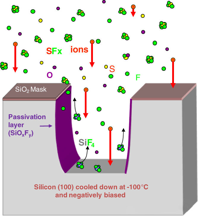A kristályos szilíciumot példának vesszük, a szilíciumatomok elrendezése a kristályok orientációja szerint eltérő, ami a maratógázzal való reaktivitás és a maratási sebesség eltéréseit eredményezi. A maratás során ezek az anyagtulajdonságok különbségei az oldalfalak különböző helyein inkonzisztens maratási mélységekhez vezetnek, ami végső soron az oldalfal meghajlását okozza.