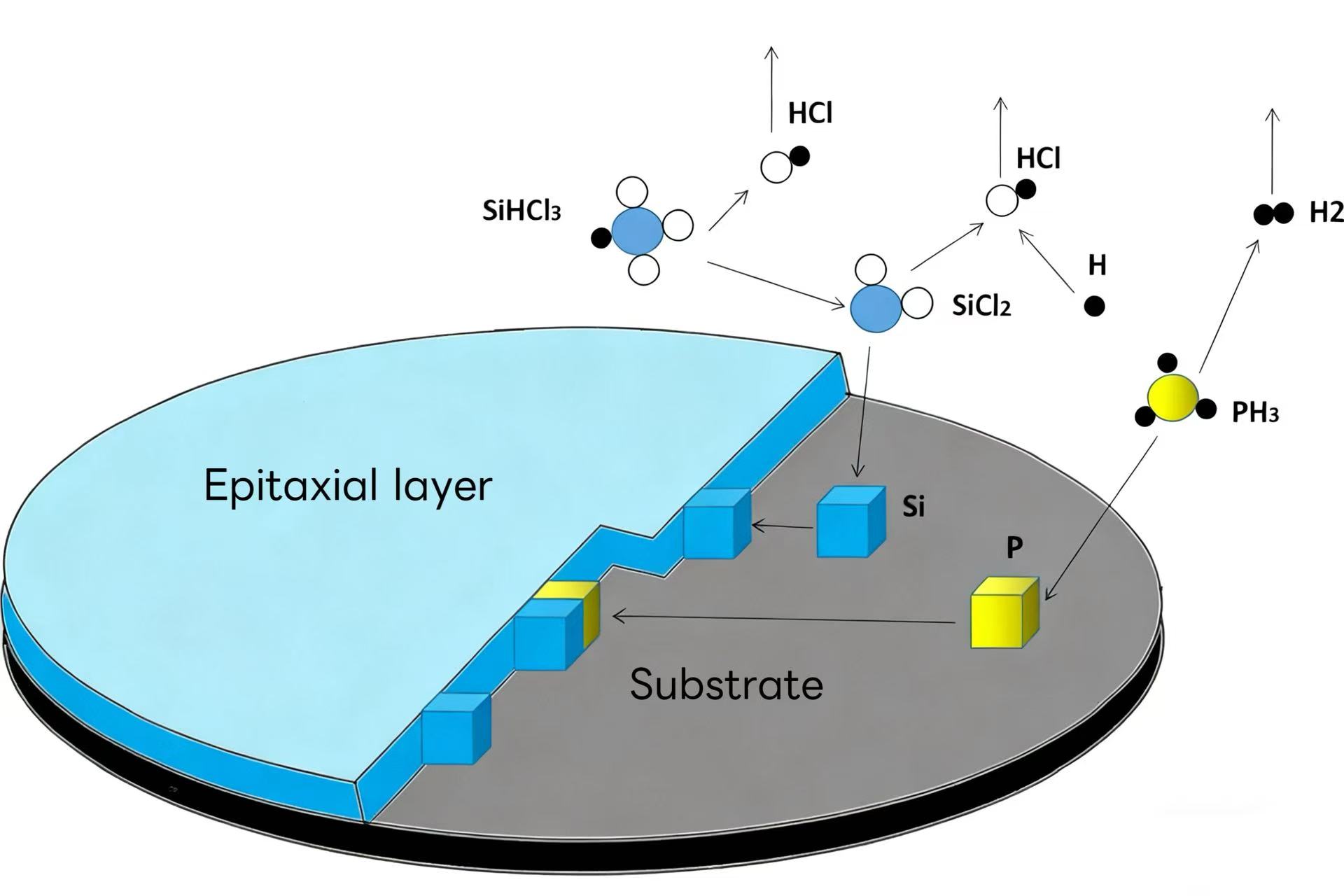 A szilícium epitaxia általában gőzfázisú epitaxiás kemencét használ. Elve az, hogy a szilíciumforrás (pl. szilán, diklórszilán, triklórszilán és szilícium-tetraklorid) bomlása hidrogénnel reagálva szilíciumot hoz létre. A növekedés során adalékgázok, mint a PH3 és a B2H₆ egyidejűleg vezethetők be. Az adalékkoncentrációt a gáz parciális rexiális nyomásával pontosan szabályozza egy epitazisztikus réteg.