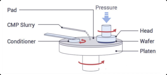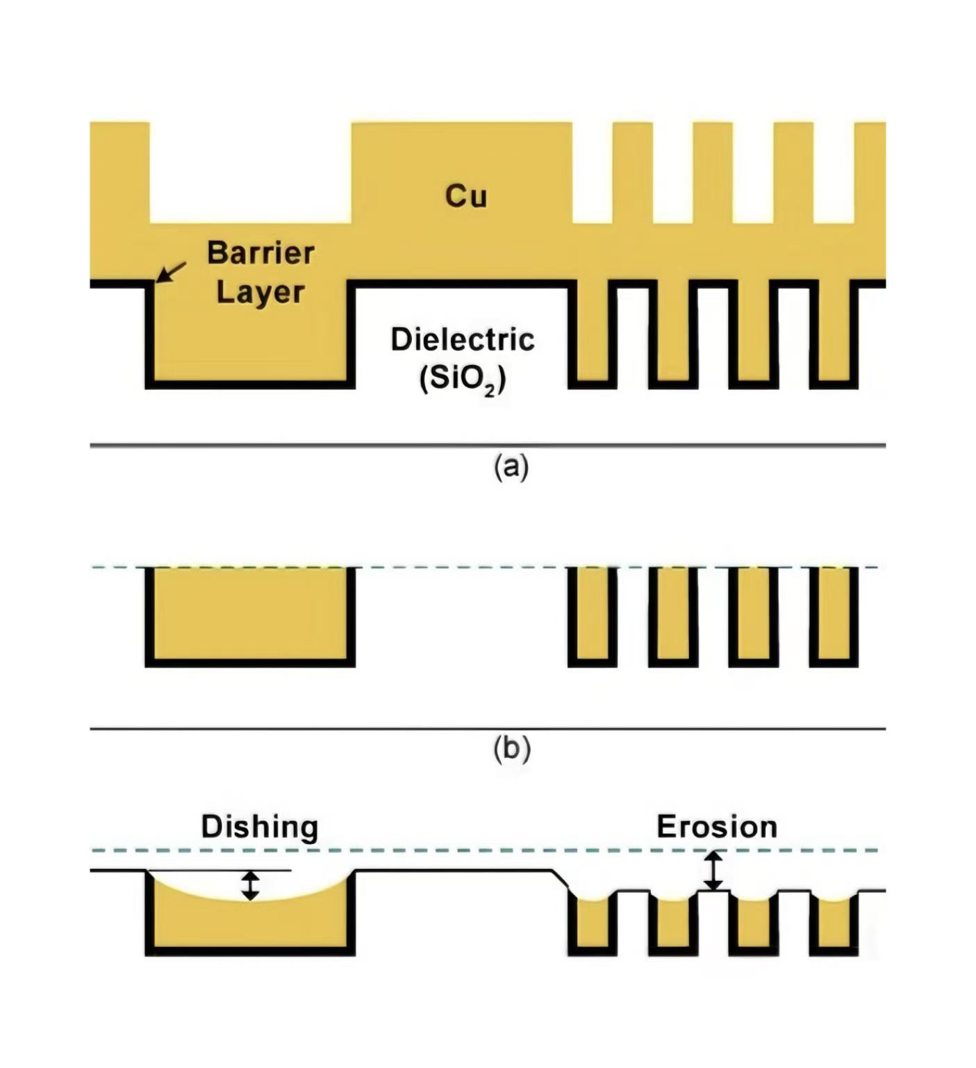 A kémiai mechanikai polírozás (CMP), amely a kémiai korróziót és a mechanikai polírozást egyesíti a felületi hibák eltávolítása érdekében, a jelentős félvezető eljárás a felület általános síkosításának eléréséhez.ostyafelület. A CMP két felületi hibát eredményez, az omlósodást és az eróziót, amelyek jelentősen befolyásolják az összekötő szerkezetek síkságát és elektromos teljesítményét.